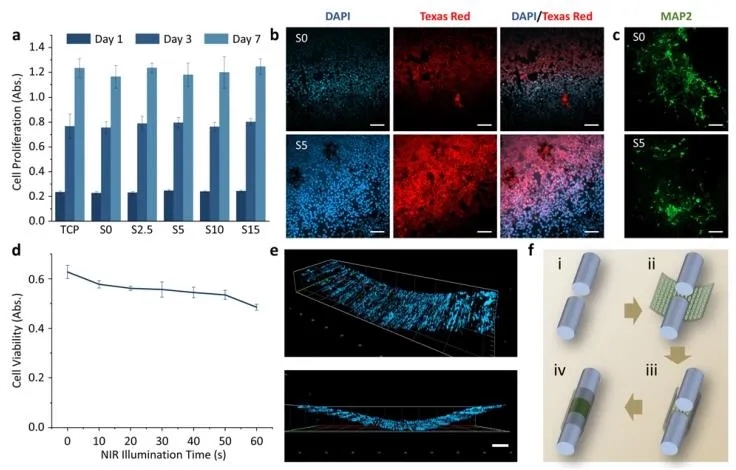 PPy@Fe₂O₃的S5样品对神经干细胞(NSCs)黏附、增殖和分化的影响。结果表明,NSCs在材料表面黏附良好,培养7天内增殖正常,诱导分化10天后表达神经元标志物MAP2,证明材料具有优异生物相容性,且半管状结构经NIR触发变形后可引导细胞三维分布。