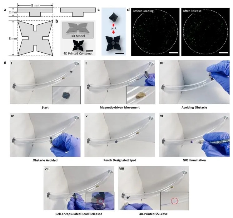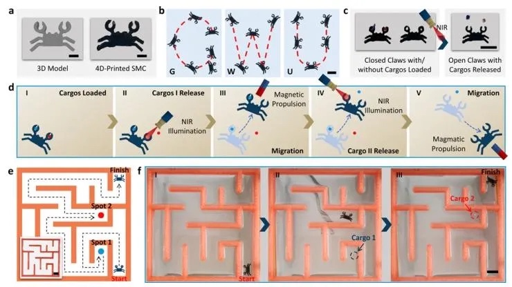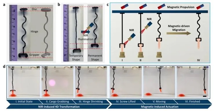 NPs)掺杂到热响应SMP基质中,赋予材料NIR光热效应与磁场响应双重功能。基于该材料,团队利用4D打印技术制备了半管状结构用于调控神经干细胞行为,并设计了智能抓手、智能螃蟹、智能星等三款概念验证型机器人,实现了货物抓取、运输、释放及三维空间导航等复杂操作的NIR和磁场远程控制。