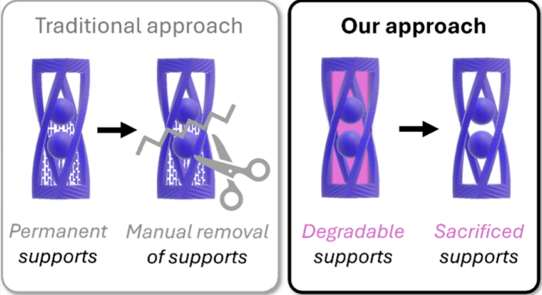 传统的光聚合类3D打印(如SLA/DLP)在打印复杂结构(如悬臂、互锁件)时,必须依赖支撑结构来维持构建过程中的几何稳定。然而,这些支撑结构通常与主体材料相同,后处理需要机械方式拆除,不仅耗费人力、影响表面质量,甚至可能导致结构损伤。