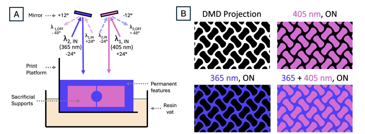 为了实现波长选择性打印,团队构建了一台定制化“双波长负像成像(DWNI)”DLP打印设备。该系统通过单一数字微镜装置(DMD)控制两个不同波长(405 nm与365 nm)的光源,实现同层不同区域光化学选择性激发。技术核心在于: