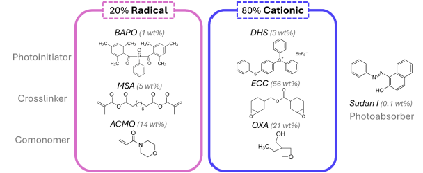 △双波长树脂在一个锅中同时将自由基和阳离子网络融合在一起,包括每个反应的光启动器,交叉链接和联合工具。