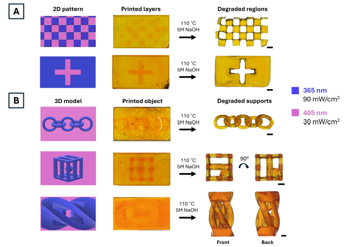 在树脂系统方面,研究人员精心筛选光引发剂、交联剂和辅助单体,构建出双功能配方。可降解网络采用甲基丙烯酸酯与琥珀酸交联体系,不仅具备快速光聚性,还可在碱性溶液中快速降解。永久网络基于环氧单体与催化剂配合体系,经紫外照射后能形成高交联度、耐热耐水解的结构。
