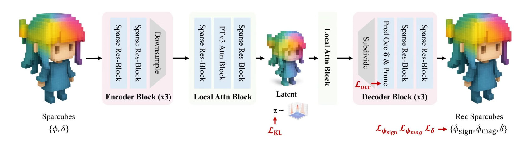 的稀疏可变形行进立方体结构与名为 Sparconv-VAE 的模态一致性自编码器相结合。Sparcubes