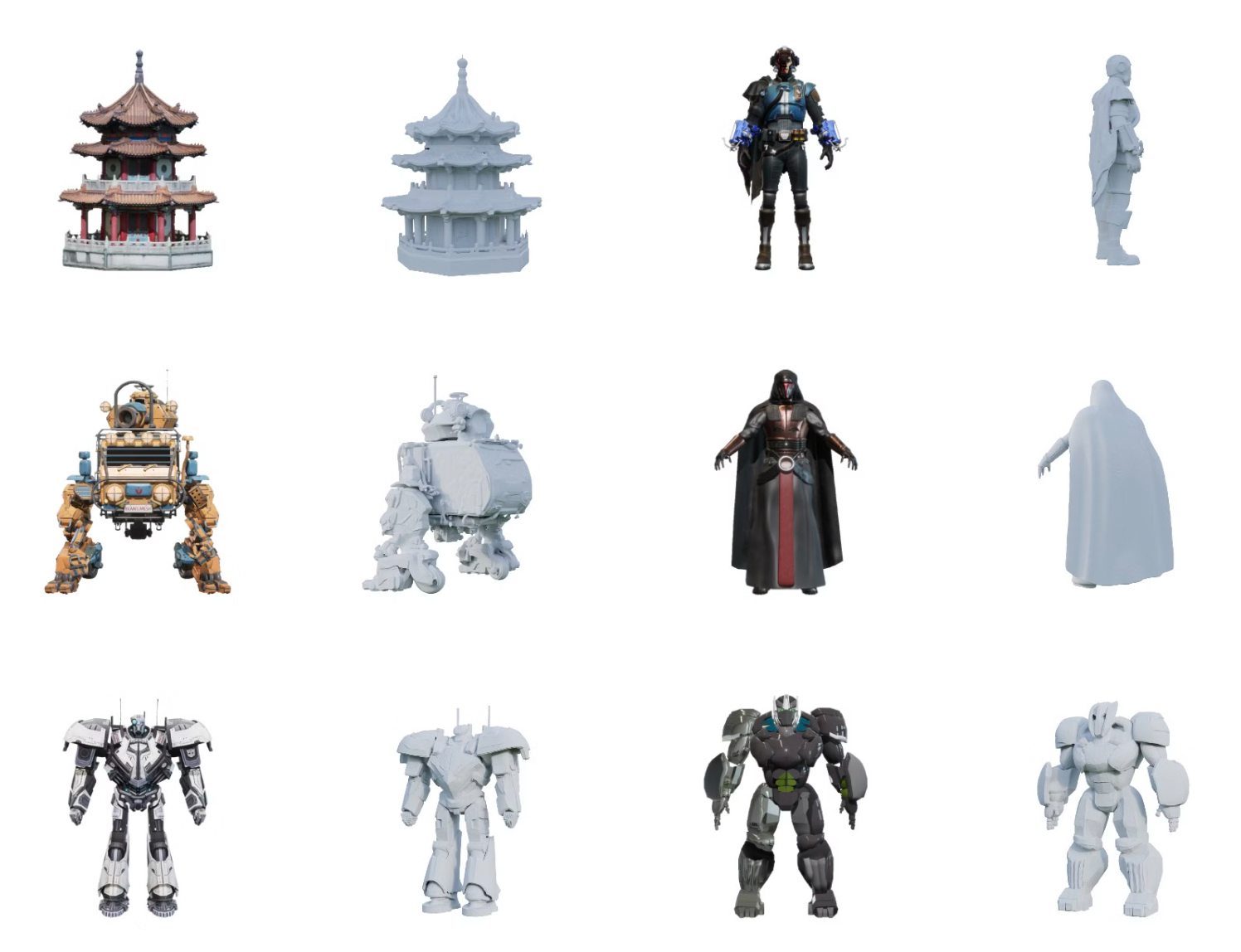 和重建精度等定性和定量指标方面均表现出色。系统能力在输入噪声大、不完整或几何形状复杂的挑战性场景中尤为突出。凭借高保真度和一致性,这套系统已被广泛应用于游戏开发、VR/AR、电影制作和数字孪生技术等行业。