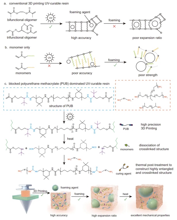 来自中国科学院福建物质结构研究所吴立新研究员和翁子骧高级工程师开发了一种含动态聚脲键的聚氨酯预聚体(PUB)基光固化树脂体系。通过引入热膨胀微球(TEMs)作为发泡剂,利用动态共价键热解离特性,在紫外固化时维持高模量保证打印精度,加热后降低交联密度使TEMs膨胀成孔,同时热引发链延伸和二次交联提升泡沫拉伸性能(应变达650%)。该体系解决了光固化技术中发泡与精度难以兼顾的难题,实现了高精度打印与高膨胀率的平衡。