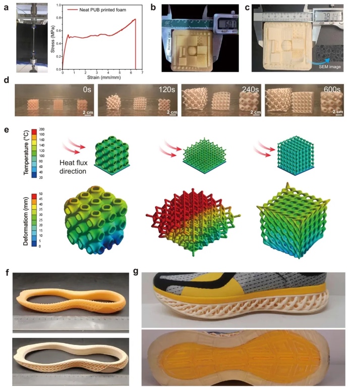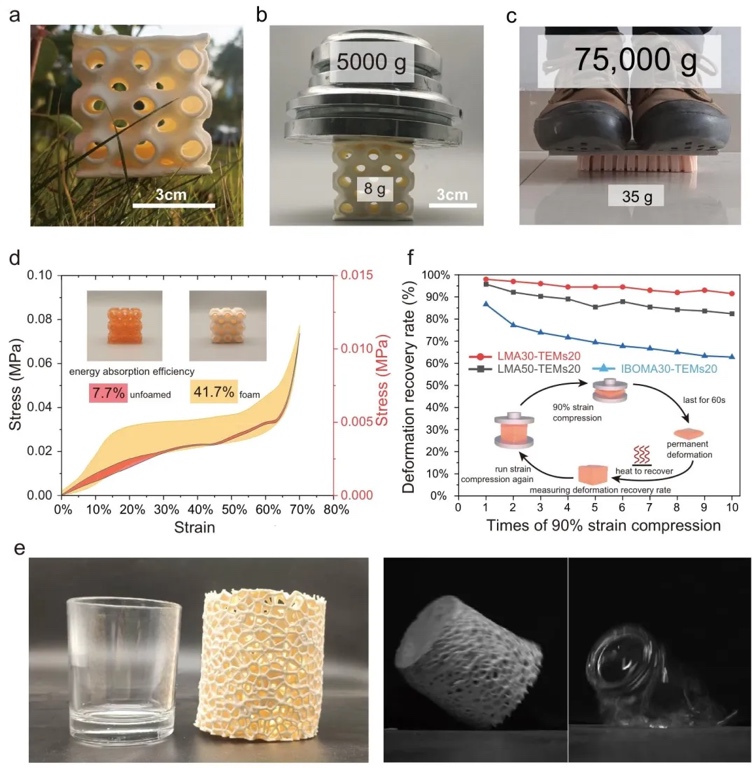 g/cm³,满足多种应用需求。值得注意的是,打印泡沫经形变后可通过简单热处理恢复并重复使用。该可发泡紫外固化树脂使现代VPP技术能够制备广泛应用的聚合物泡沫材料,为高精度、高机械性能泡沫的3D打印提供了新策略,在轻量化结构、缓冲保护和功能器件等领域展现出广阔应用前景。