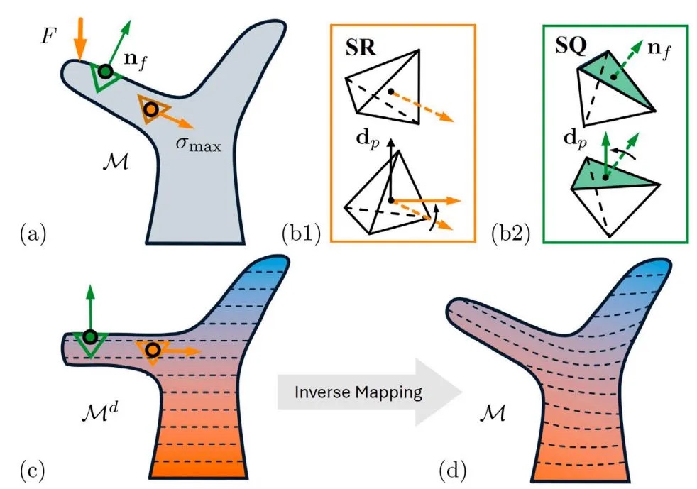 该研究采用系统性的方法来解决连续纤维增强热塑性复合材料(CFRTP)在多轴3D打印中的路径规划难题。首先,研究团队创新性地引入了2-RoSy表示法来处理主应力场的方向模糊性问题。这种方法通过将传统向量场转换为具有180度旋转对称性的方向场,有效消除了应力场中因特征值分解导致的随机方向翻转问题,为后续路径生成奠定了数学基础。在此基础上,研究团队开发了一种周期性标量场转换技术,通过构造一个与2-RoSy方向场垂直的标量场,并利用Marching