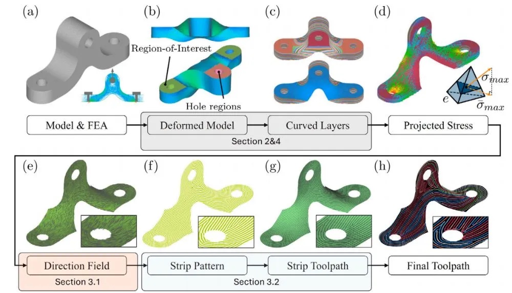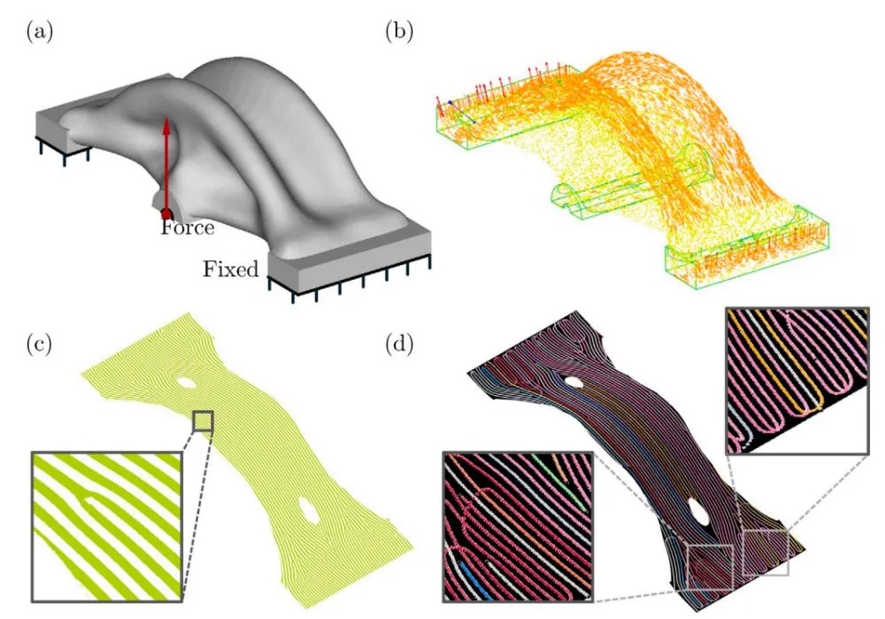 CFRTP)增材制造的研究成果。该研究提出了一种基于主应力引导的高密度纤维路径生成方法,通过优化方向场和周期性标量场生成等距纤维路径,有效克服了现有方法在纤维覆盖密度和方向一致性上的局限性。论文标题为“Toolpath