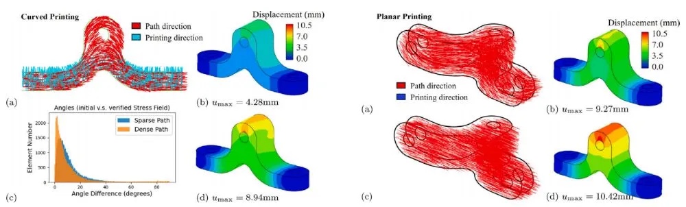 Squares算法提取其等值线作为纤维路径。这一创新使得生成的路径不仅严格遵循主应力方向,还能保持近乎相等的间距,从而实现了高达87.5%的纤维覆盖率。为适应复杂几何形状,研究还扩展了基于四元数的S³-Slicer曲面切片算法,通过局部旋转优化和全局变形控制生成曲层,并特别设计了高度一致性约束来优化孔洞周围的纤维缠绕。