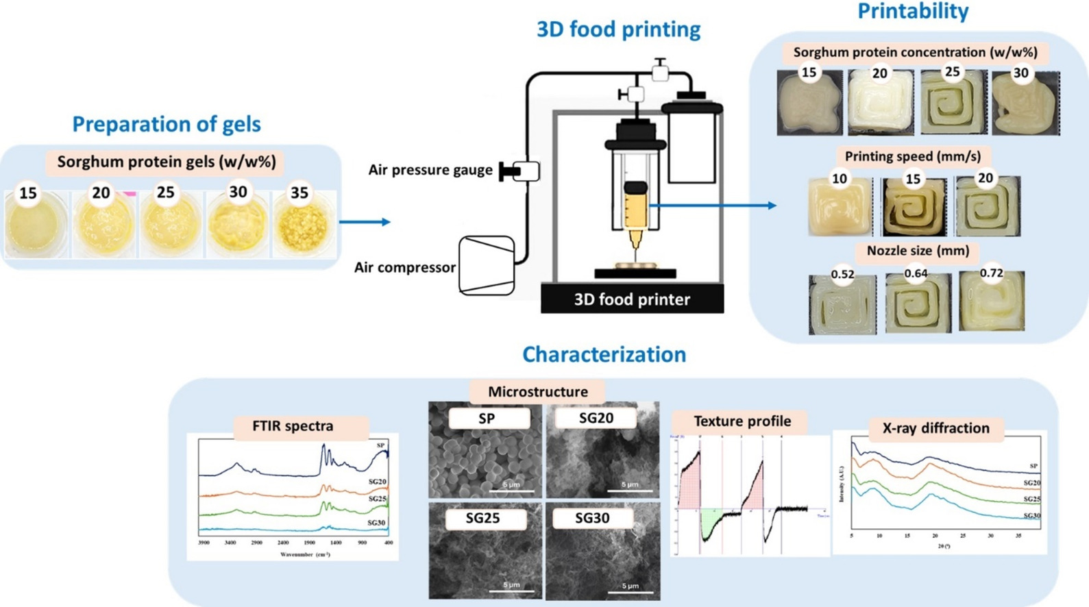 15%、20%、25%、30% 和 35% ( w/w) 的凝胶。,并评估了流变特性、可打印性、宏观和微观结构以及结晶度。