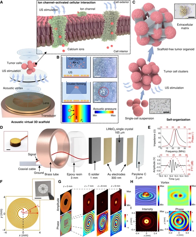中南大学的陈翔教授、陈泽宇教授和西安电子科技大学的费春龙教授团队通过声学虚拟3D支架(AV-Scaf)技术实现了肿瘤类器官的无基质胶培养,并进一步构建了肿瘤类器官-T细胞共培养系统。通过超声换能器和透镜产生聚焦声涡旋,实现了肿瘤细胞在焦平面内的聚集。
