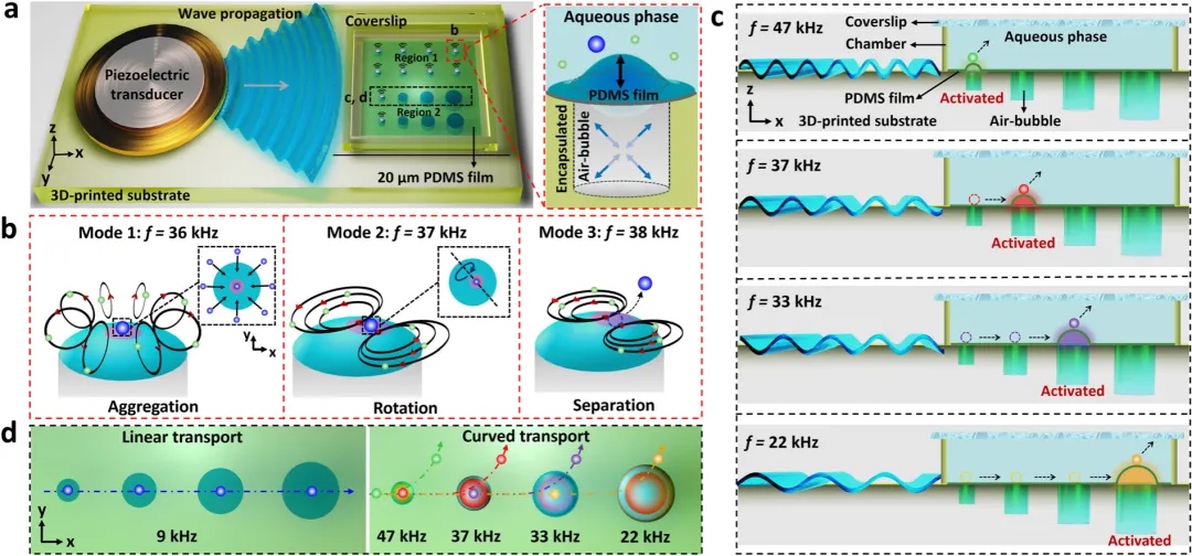 打印系统制备,通过在直径和高度方向上的精准控制,实现了多种尺寸微孔结构的加工,从而为频率选择性设计提供了高度灵活性。通过调控阵列耦合结构与激励频率,该平台能够实现精准的多模态样本处理,为生物医学与药物筛选等领域的复杂操作需求提供了新路径。