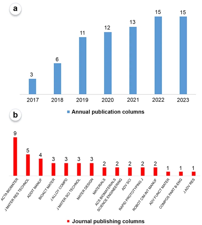 2017年到2023年,增材制造可生物降解锌基材料的发表论文数量呈现稳步增长的趋势。其中Acta