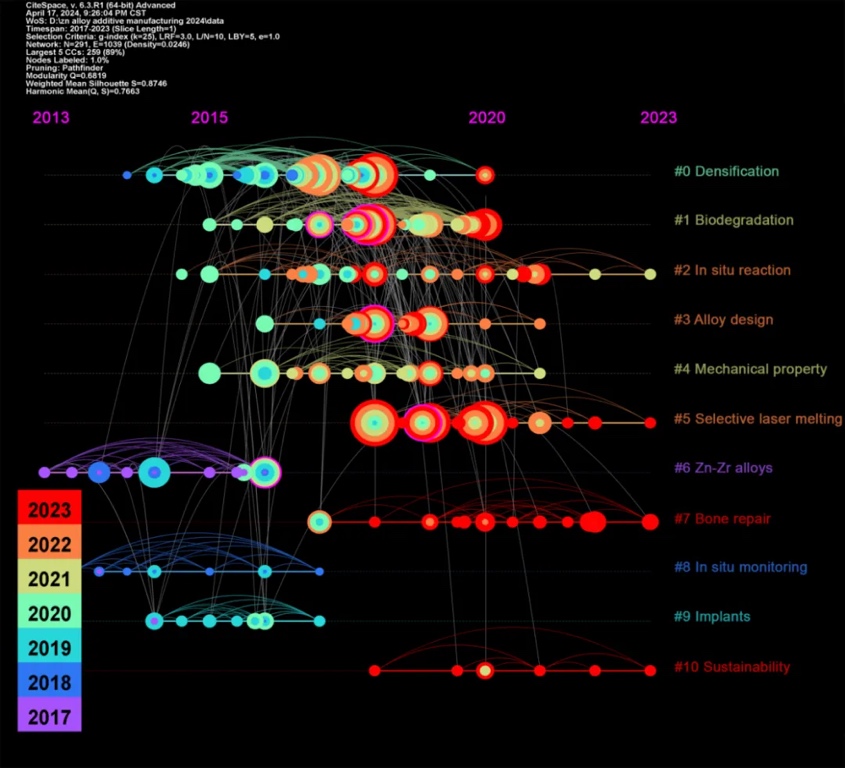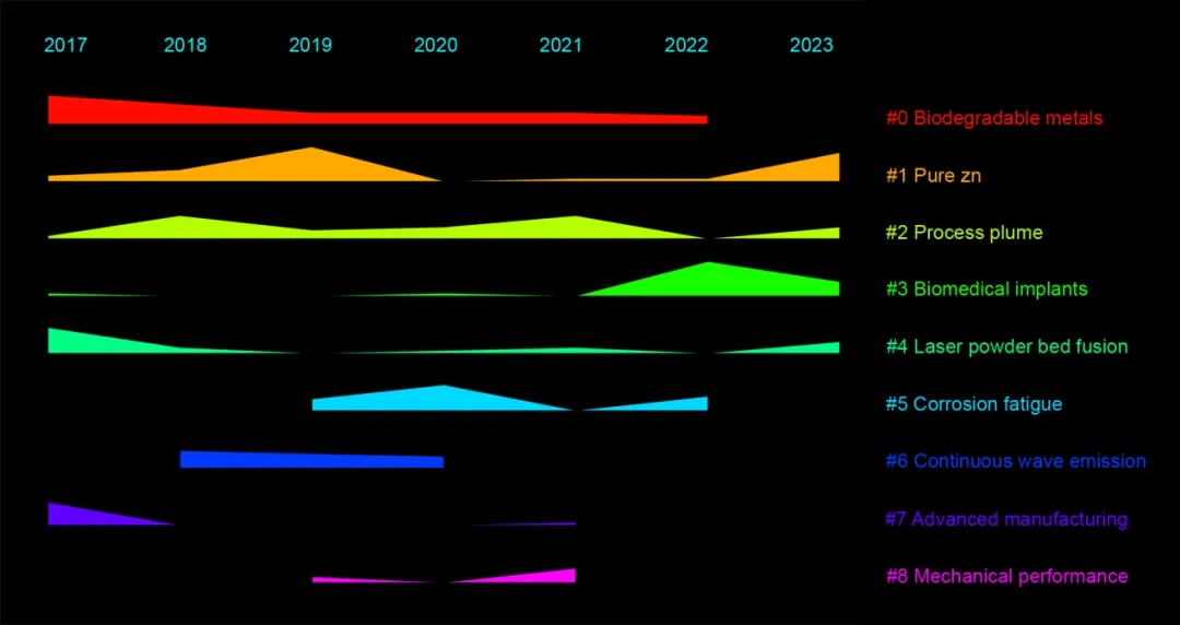 基于引文聚类可视化,本文对增材制造生物可降解锌基材料研究中的新兴、经典和相对过时的主题进行了预测。时间轴图展示了在指定时间范围内的11个簇群,按集群大小自上而下排列。簇群#0、#1、#3和#4代表经典主题。尽管这些簇并非最新出现,但它们与其它簇之间存在着复杂的相互联系。第6簇
