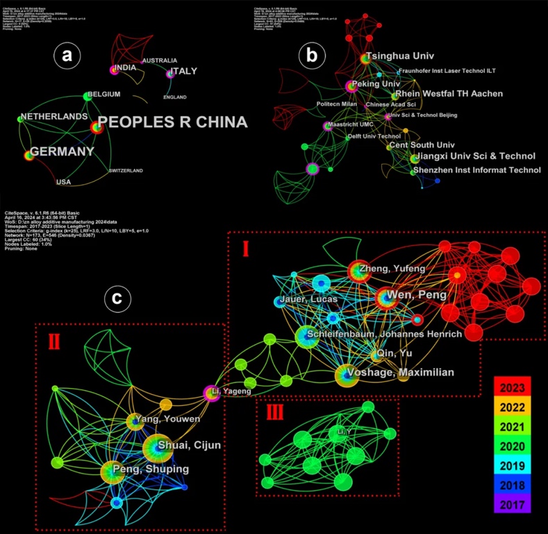 丰富的节点和相互关联的链接揭示了国家、机构和作者之间紧密的科学合作关系。国家协作网络有17个节点和28个链接,其中中国、德国、意大利、荷兰和印度作为大节点,在增材制造可生物降解锌基材料的全球合作研究中具有重要地位。机构协作网络涉及93个节点,209个连接,清华大学、江西理工大学、德国亚琛工业大学、北京大学和中南大学因其广泛的合作关系成为突出的节点。作者协作网络共有173个节点和546个连接,其中Wen
