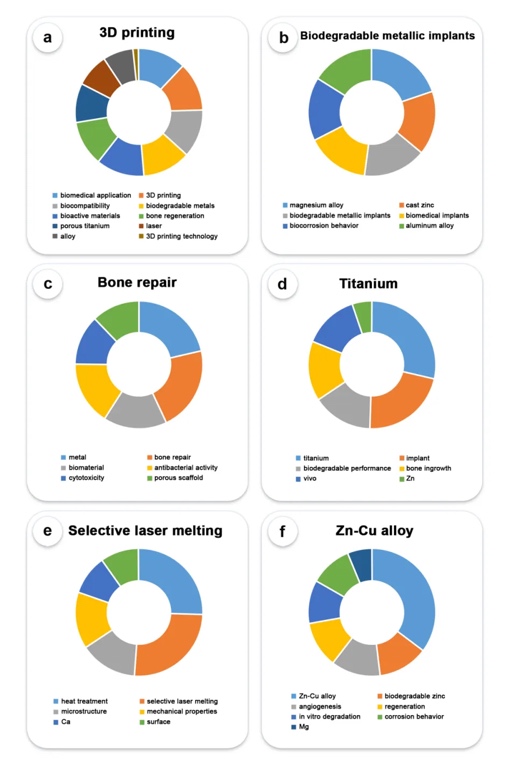zinc等涉及增材制造的常规加工工艺和组成成分的关键词外,更多的是类似于biodegradable metallic implants、bone