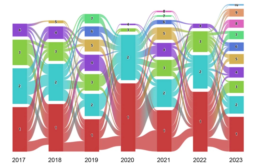 链接的关键词可以组合成特定的研究模块,这些模块随着关键词的重新组合,在不同时间段内可能会发生演变,分化或整合形成新的研究模块。。在7年的时间里,有些关键词展现出持久的影响力,有些成为了新的研究趋势,有些则淡出了研究领域。例如,2023年模块1中包含的关键词在本研究流域发散或汇聚,形成了最大的研究支流(红色标记部分)。这一现象表明模块1是一个持续存在且具有稳定性的研究模块。