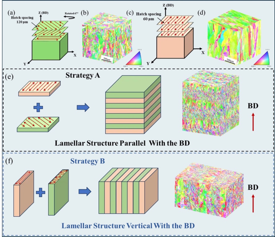 软件直接设计并优化了三维模型的几何尺寸与空间布局。通过在不同区域采用多组工艺参数,成功制备出由细晶(FG)层与粗晶(CG)层交替组成的异质层状结构,实现了晶粒尺寸的梯度调控。此外,该策略允许对层状结构的构筑方向以及FG/CG层的厚度进行定制化设计(图1所示)。这一方法验证了利用LPBF技术精确设计与控制微观结构的可行性,为创建具有优异力学性能的异质结构提供了一条有效途径。