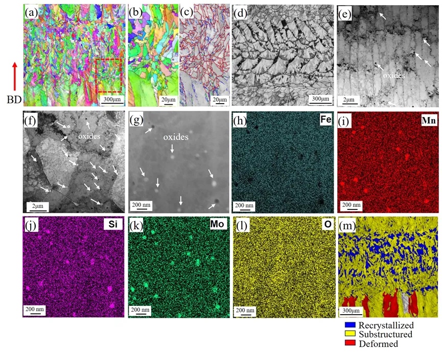 异质层状结构中,粗细晶粒尺寸与形貌主要通过激光参数进行调控。采用层间单一方向扫描策略以及适当高的扫描速度和搭接间距,可以获得定向生长的粗大的柱状晶,而采用层间旋转67°扫描、低的扫描速率和较大搭接间距可以获得等轴细晶组织。打印工艺参数差异直接影响熔池传热和过冷度,进而导致微观组织发生转变。采用EBSD和TEM对粗细晶界面处的微观组织进行细致表征(图2),发现细晶区存在大量弥散分布的纳米氧化物颗粒,这些氧化物颗粒作为形核点,促进等轴晶的形成。此外,作者认为在LPBF过程中的本征热处理引起的热循环以及微区塑性变形,可以促进动态回复再结晶,从而导致316L样品中晶粒进一步细化。
