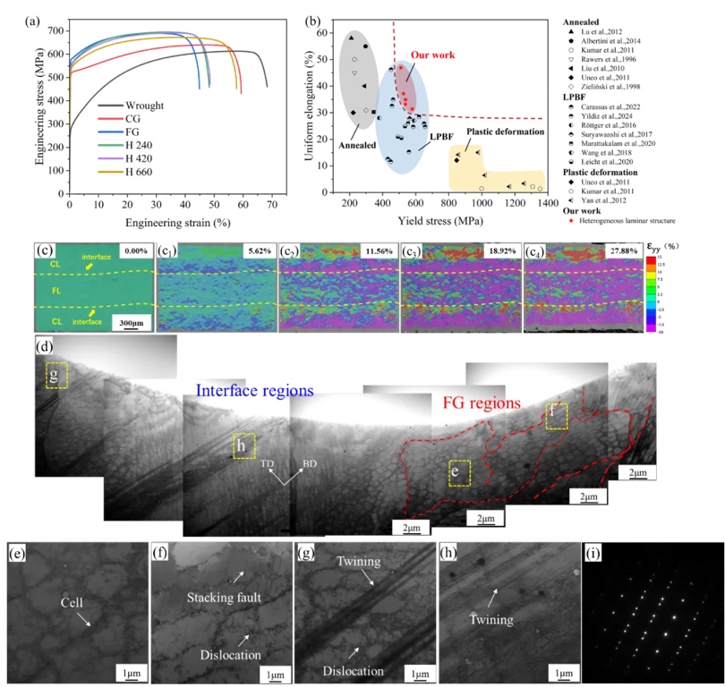 通过LPBF制备的异质层状结构试样展现出优异的强度-延展性,其强度介于LPBF制备的纯细晶样品和纯粗晶样品之间,但延展性远高于细晶样品。作者将层状结构316L样品的屈服强度、延伸率与其他相关工艺制备的316L样品进行比较,该异质结构样品的强塑性优于同类别的316L不锈钢样品。图3