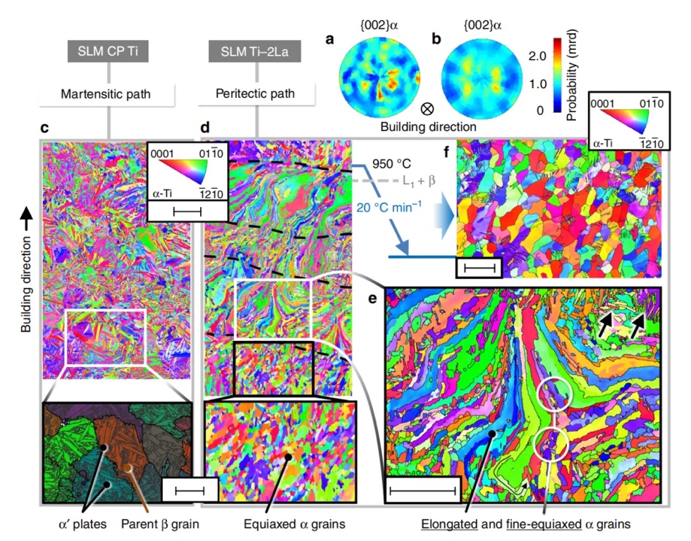 图5:降低钛合金增材制造中的凝固织构。通过添加包晶形成溶质La,形成具有多取向的细α颗粒。a,b:分别为Ti-3wt.%