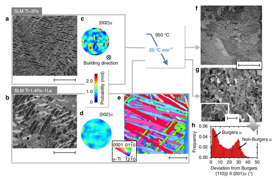 μm)。前者α相直接从母β晶粒形成:典型β→α相变路径导致层状α+β显微结构。后者存在额外α形成路径,与母β相取向关系无关。c,d:分别反映Ti-3Fe和Ti-1.4Fe-1La的{002}α重建极图。e:SLM