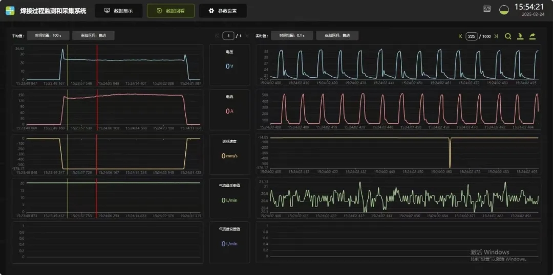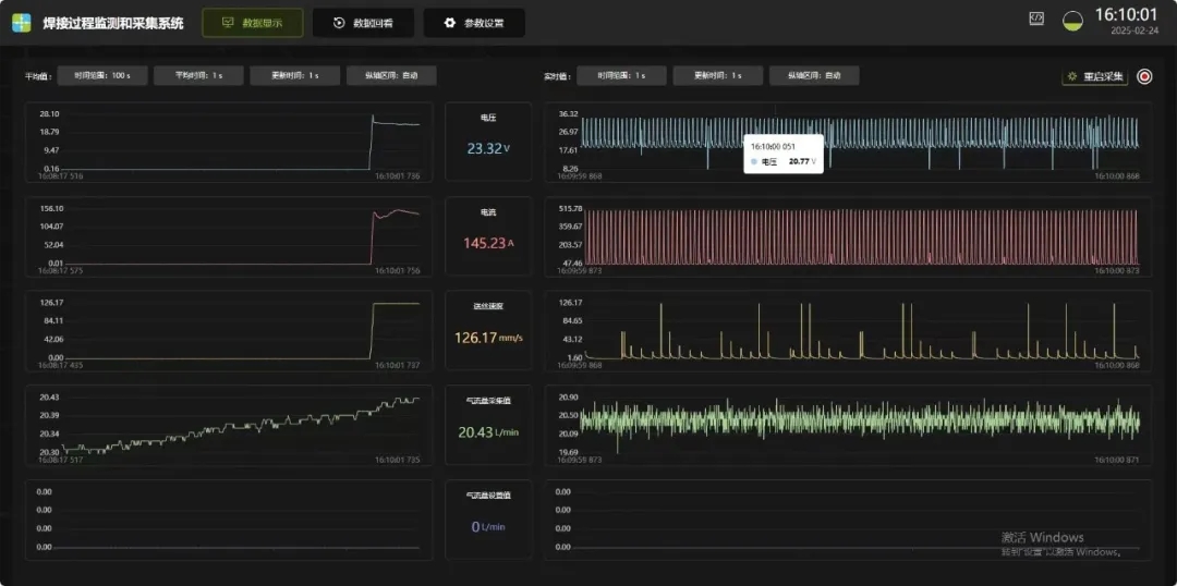 该系统支持高达25kHz的采集频率,通过高频采集能够实时采集焊接过程中的电流、电压、送丝速度、气流量等关键参数,用户能通过系统自带可视化界面直观监视数据的动态变化,随时掌握焊接状态,对焊接过程中工艺参数偏离导致的可能存在的缺陷进行预判断,从而实现设备智能化管理和生产过程质量管理。