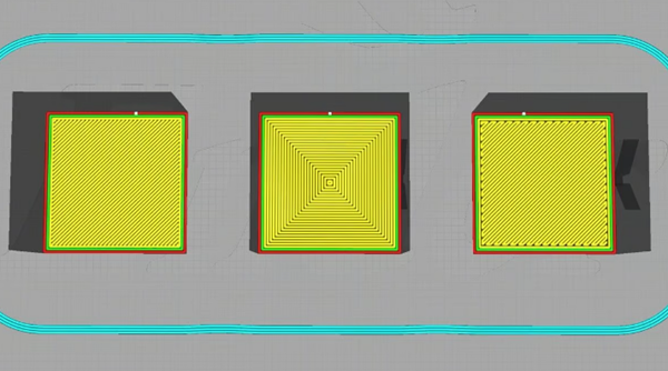 Cura还提供了更改初始层图案的选项。您可以选择线、同心或锯齿形图案。此设置会更改第一层上的细丝线的方向,这可能会对零件强度产生轻微影响,并改变3D打印底面的外观。