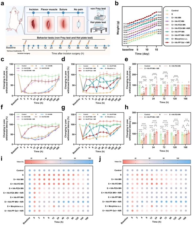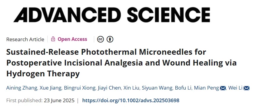 为此,武汉大学药学院黎威教授团队、武汉大学中南医院彭勉教授团队联合开发了一种新型的光热微针系统,通过持续释放H2来缓解术后疼痛,并促进伤口愈合,为个性化镇痛治疗提供了新的解决方案。相关研究成果以“Sustained-Release