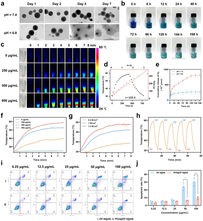 该系统的核心是通过聚多巴胺(PDA)修饰的ZIF-8@氨硼烷(AB)纳米粒子,结合温度响应型聚己内酯(PCL)微球,负载于透明质酸基质的可溶性微针贴片中,可在酸性微环境中持续释放H2并通过近红外(NIR)光热效应控制药物释放。其中,该微针贴片(HA-PP