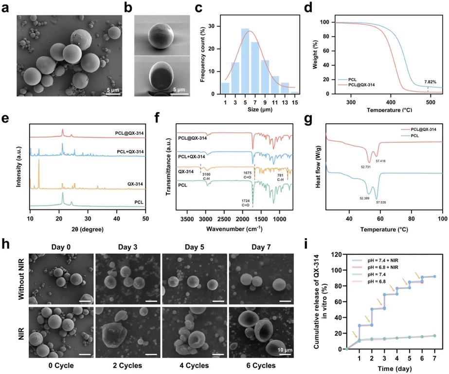 μm)3D打印设备加工模具后经PDMS翻模制备而成的。研究发现,PDA@ZIF-8@AB纳米粒子能在术后酸性环境中持续释放H2,缓解疼痛并促进创伤愈合,而PCL@QX-314微球则通过NIR激活,精确控制局部麻醉药物QX-314的释放,从而达到个性化的镇痛效果。