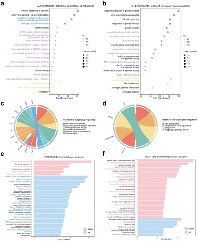 本研究的转录组学分析深入揭示了H2对镇痛和组织修复作用的分子机制。数据表明,术后损伤及其相应治疗涉及多条生物学通路的调控。手术创伤引发了明显的炎症反应和氧化应激,同时上调了与疼痛相关的信号通路及受体活动,如前列腺素受体活性。这表明,手术刺激引发的炎症及其他应激反应在术后疼痛的发生中起到了关键作用。而在释放H2的治疗微针组中,基因表达显示出镇痛和组织修复的双重效应。在治疗组中,抗氧化应激相关通路的上调提示H2可能通过缓解氧化损伤来促进组织修复并加速伤口愈合。同时,周细胞分化、NADPH活性和细胞外基质调控等相关通路的上调进一步说明释放H2的治疗微针在促进组织再生和炎症消退方面的作用。此外,免疫相关通路的调控突出了H2在调节炎症中的重要作用。而疼痛相关信号通路的下调,如前列腺素受体活性和MAPK信号通路,则进一步验证了释放H2的治疗微针在镇痛方面的潜力。