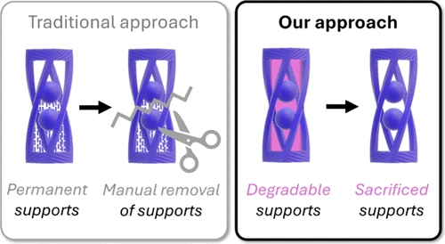打印的双波长树脂系统。这项研究展示了一种创新的“一锅法”树脂配方,它能够同时打印出永久性结构和可降解支撑。这项技术的优势在于无需更换树脂或进行手动支撑移除,这大大简化了打印过程。