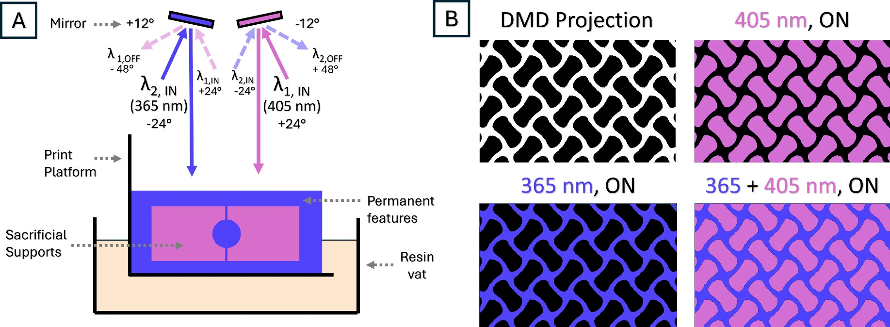Moran开发的专利双波长负像(DWNI)DLP打印机。这种打印机仅使用一个数字微镜装置(DMD)即可同时投射紫外光和可见光。通过精确控制微镜的倾斜角度,系统能够选择性地将不同波长的光投射到每个像素上,实现了在同一层上对两种材料进行图案化,避免了光学重叠的问题。