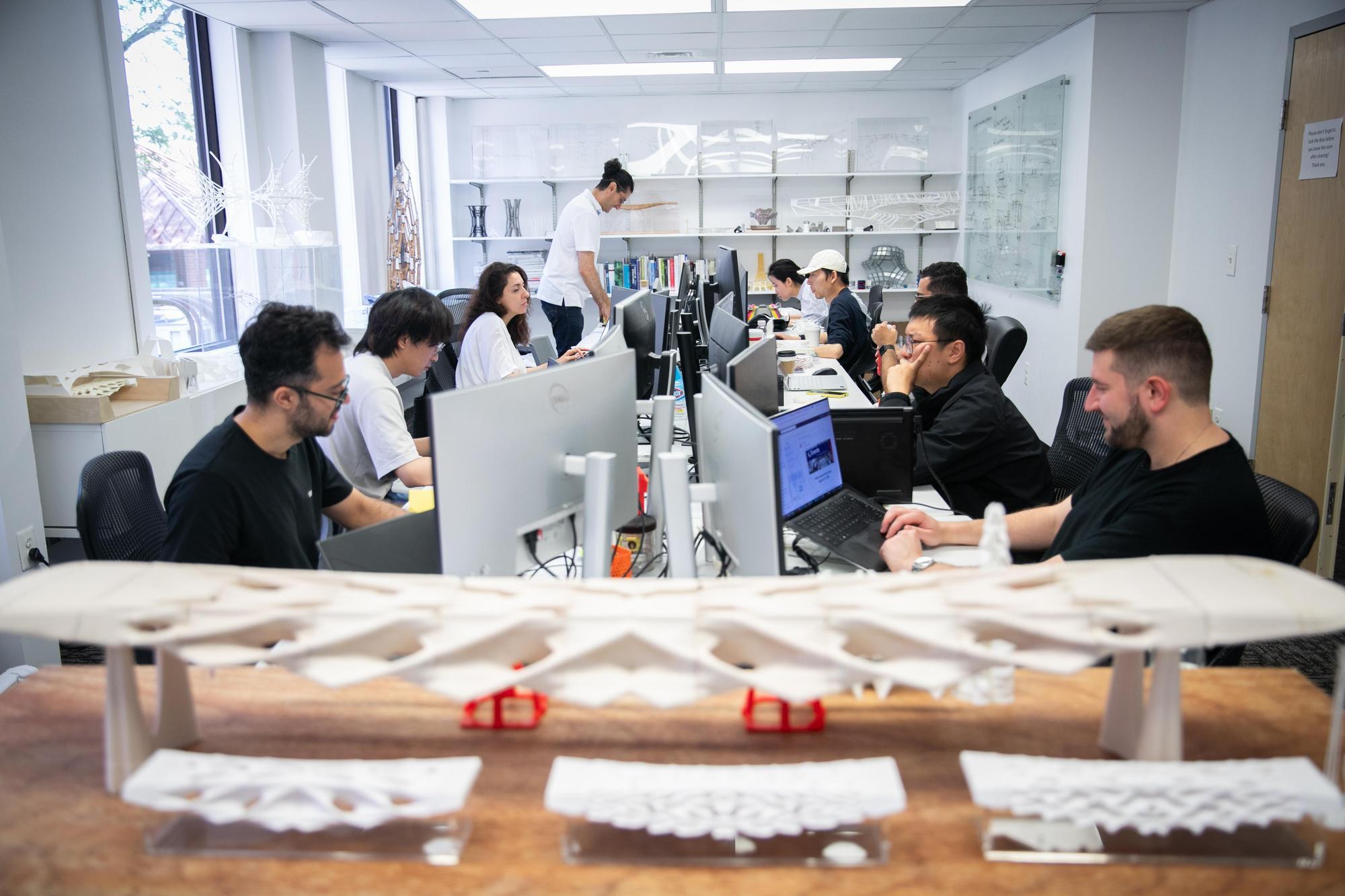 研究人员:(左)马苏德·阿克巴扎德 (Masoud Akbarzadeh) 是威兹曼设计学院的建筑学副教授,也是宾夕法尼亚大学多面体结构实验室的主任。(右)杨舒是约瑟夫·博尔多尼亚工程与应用科学教授,也是工程与应用科学学院材料科学系的主任。
