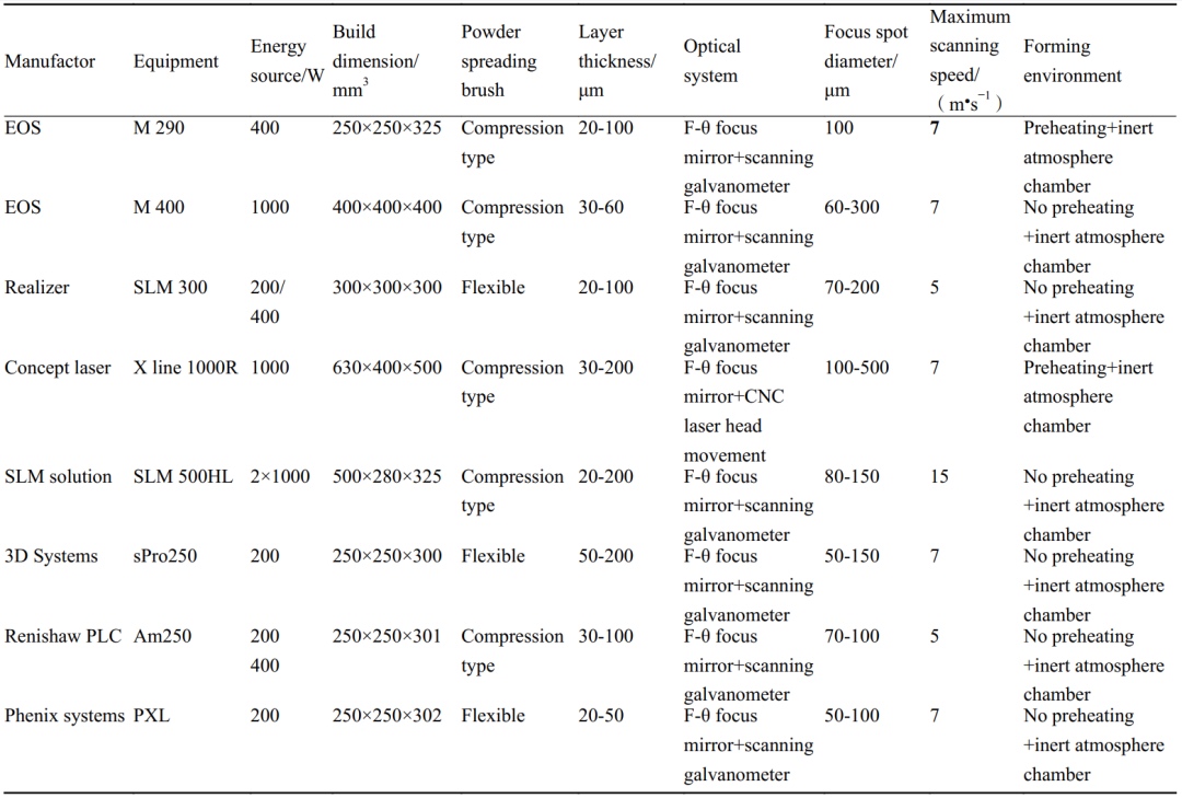 目前国际上主要SLM装备的技术指标如表1所示,其中Concept Laser公司生产的SLM装备可成形的零件尺寸最大,EOS公司生产的SLM装备可成形的零件尺寸次之,但是EOS公司生产的M系列SLM装备的商用化成熟度最高,应用最广。