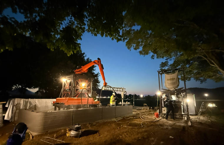经过三年潜心研发,2025年6月27日,团队在SCC校园内启动了"FloodBuster 1"的实际打印工作。为确保基础稳固,团队提前数周完成了创新设计的混凝土基础板浇筑。尽管当时正值酷暑高温,团队仍成功完成了打印任务,整个结构打印耗时53小时。这一过程吸引了约300名现场观众和100多名在线观众的关注。
