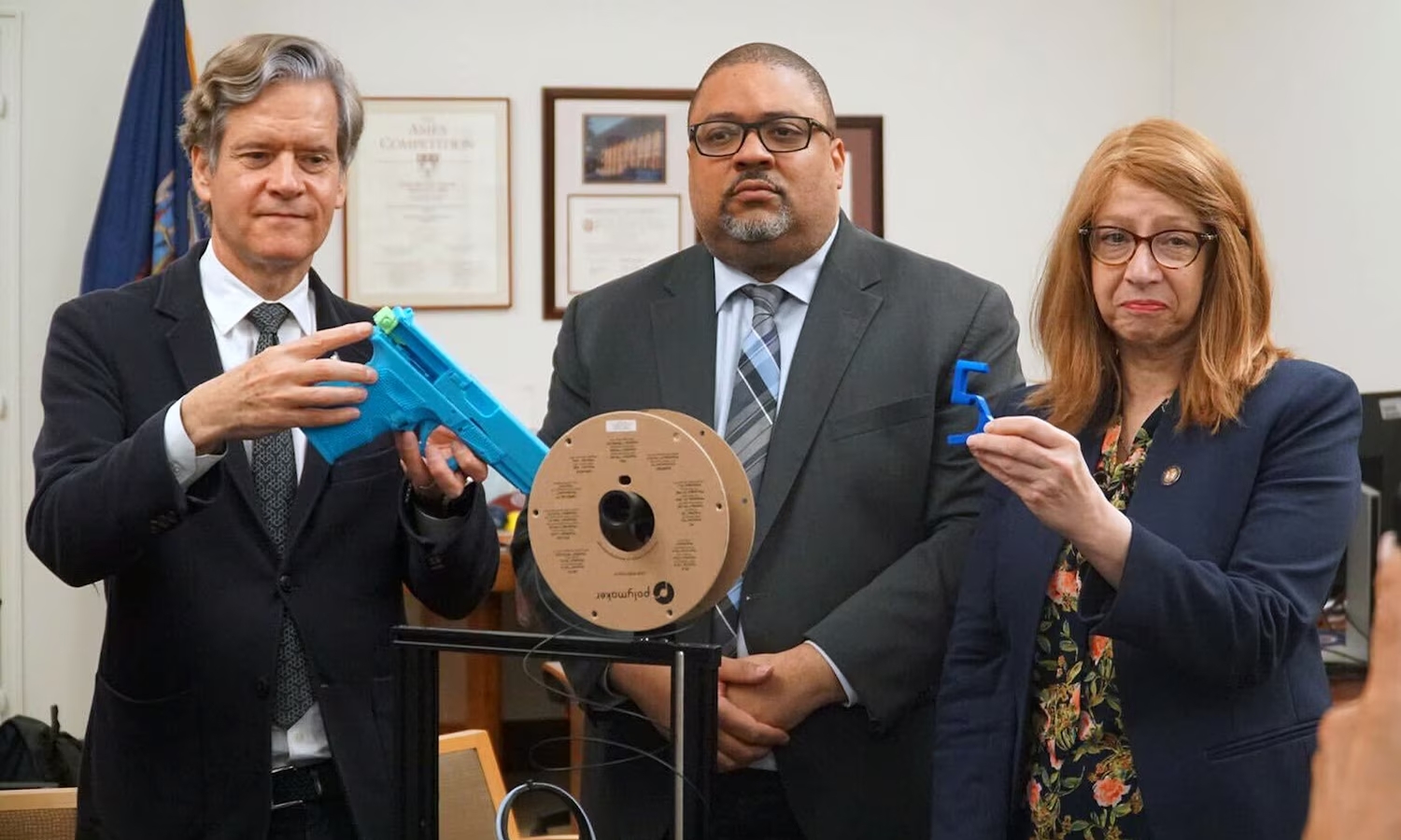 纽约州参议员布拉德·霍伊尔曼-西格尔(左)手持一把3D打印的幽灵枪,与曼哈顿地区检察官阿尔文·布拉格(中)和众议员琳达·罗森塔尔站在一起。照片来自曼哈顿地区检察官。