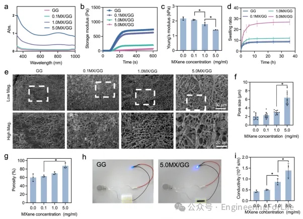 nm波长范围内的光吸收能力。同时,MX/GG水凝胶的储能模量和杨氏模量均随MXene浓度增加而降低。MXene含量的提升还增大了水凝胶的溶胀率,其中含5.0