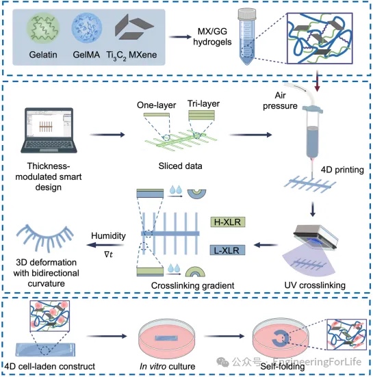 传统3D生物打印虽能构建结构复杂的体外组织,却难以模拟天然组织的动态变化过程。4D生物打印应运而生,其引入“时间”维度,使打印结构能够在外部刺激(如湿度、温度等)下发生预设的形状或功能变化。然而,现有4D打印技术面临两大关键挑战:智能生物墨水种类有限以及打印路径设计复杂,这严重限制了其应用范围。为应对这些挑战,近期,香港中文大学李中教授和段崇智教授团队开发了一种新型智能复合水凝胶(MX/GG)。该水凝胶由明胶(Gelatin)、甲基丙烯酰化明胶(GelMA)和二维过渡金属碳化物(MXene)复合而成,具备优异的可打印性、形状变形能力和细胞负载能力。同时,研究团队提出了一种简单高效的4D打印策略:通过调控结构中不同形变区域的厚度,在单次紫外(UV)光照射后即可于不同空间位置实现差异化的交联梯度,从而成功实现了湿度驱动的单向和双向自弯曲动态变形。