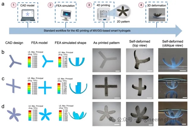 基于实验和FEA结果,我们建立了MX/GG智能水凝胶的4D打印工作流程。随后,通过打印均匀厚度的平面图案,成功制备了具有单向弯曲特性的复杂结构,包括三臂夹持器、四臂夹持器和五瓣花朵结构(图4)。然而,天然组织通常展现出具有多向曲率的复杂形状变形。为展示该策略的多功能性,我们通过编码具有不同厚度的多个变形域,打印了一系列仿生结构。这些结构在单次UV曝光下形成独特的网络梯度,实现了一系列双曲率结构,包括珊瑚虫状结构、千足虫状结构、蟹状结构和蝎子状结构