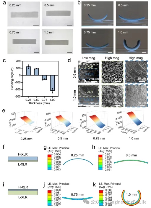 3)。浸入去离子水后,不同厚度的条带表现出截然不同的弯曲程度。值得注意的是,厚度为 0.25 mm 和 0.5 mm 的条带其自弯曲方向与