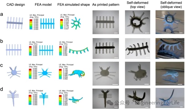 有限元分析(FEA)软件被用于模拟不同比例下条带的自变形行为,模拟结果与实验观测高度吻合。这些实验与模拟结果共同表明,仅通过调整条带厚度,在单次