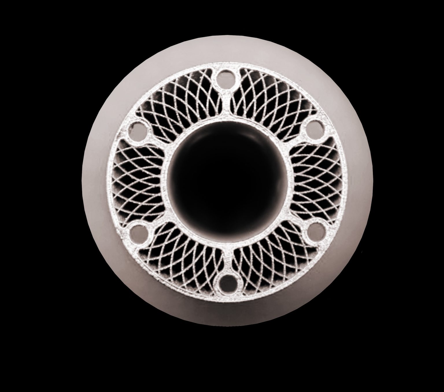 △同一铌合金部件的顶视图,显示了内部晶格和集成通道。图片来自 TANIOBIS。