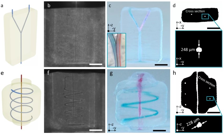 △负向EmVP 工艺用于打印带有小通道的 3D 微流体芯片。图片来自《自然通讯》。