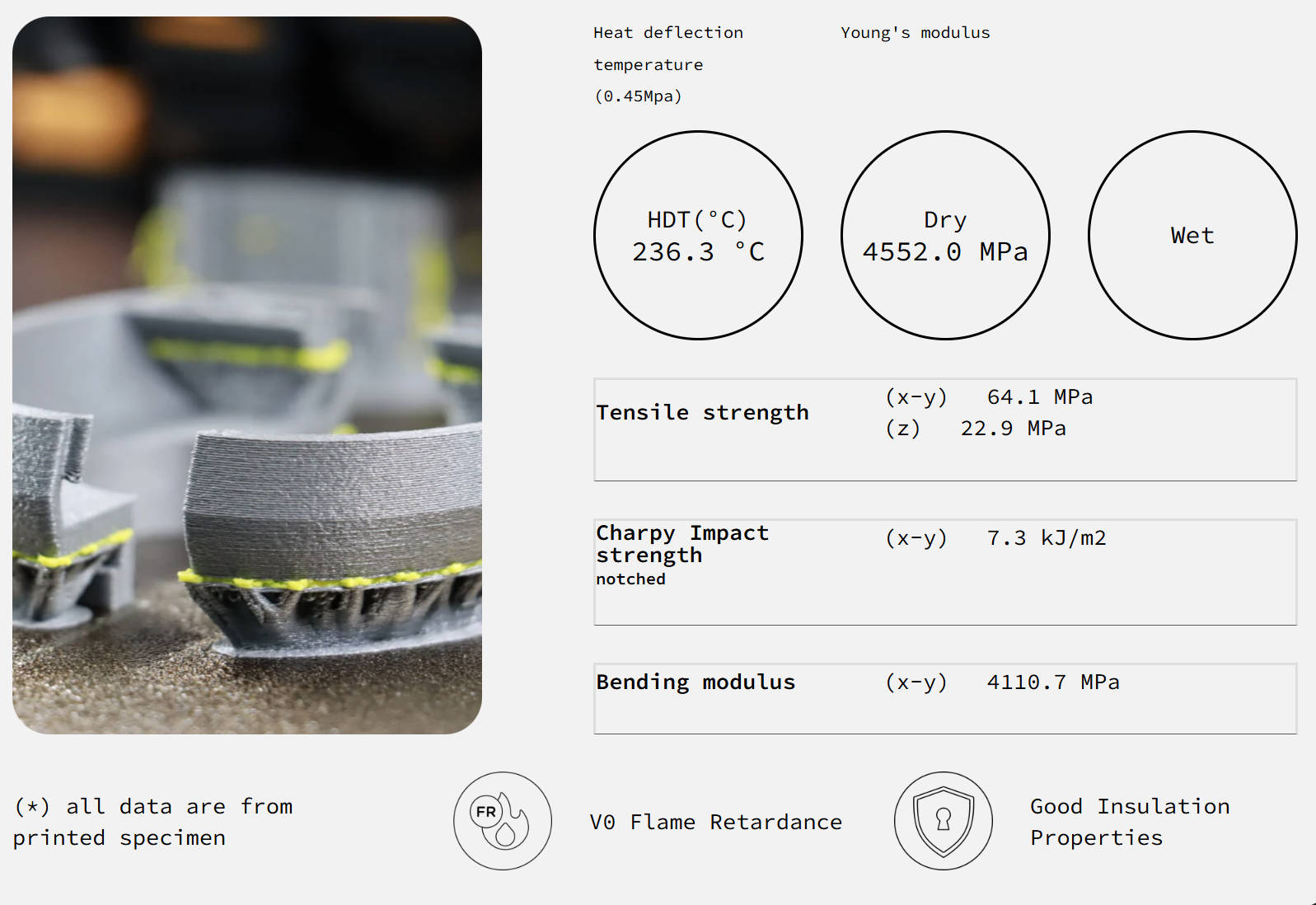 材料的吸湿率低至0.11%(在70% RH和23°C环境下测得),即使在潮湿环境中也能确保可靠的打印性能,有效解决了工业级材料对环境敏感的痛点。