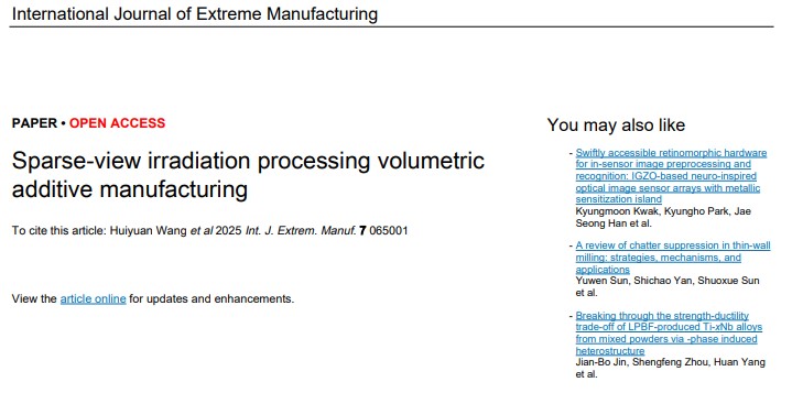 相关研究以题为“Sparse-view irradiation processingvolumetric additive manufacturing”的论文发表在《国际极限制造杂志》上,西安电子科技大学和常熟理工学院也参与了这项研究。