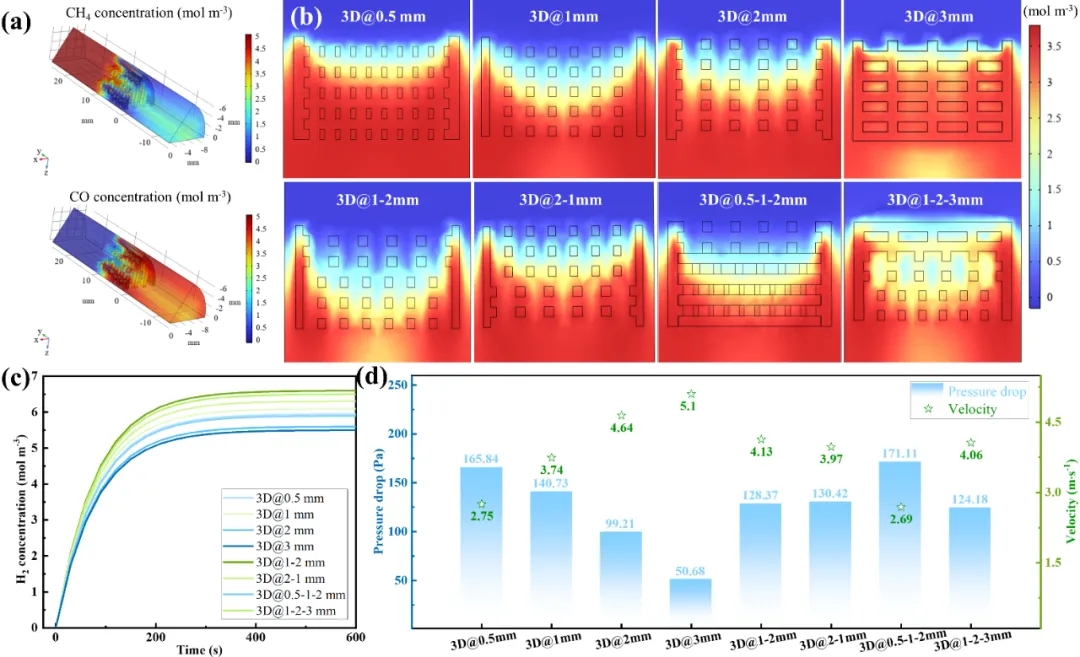 借助计算流体力学(CFD)模拟,团队系统研究了不同通道结构对压降、流速分布及反应性能的影响。结果表明,3D@1-2 mm 和 3D@1-2-3 mm等分级通道结构表现出更优流动与催化特性。相较之下,虽然3D@0.5-1-2 mm结构提供更高表体积比,但压降显著上升,导致反应效率下降。研究还发现,引入结构梯度可增强反应效率,但并非总能提升传质能力,需在“复杂性”与“反应效率”之间权衡。
