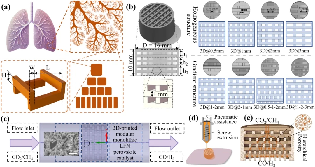 DRM)是一种将CH4和CO2等温室气体转化为合成气(CO和H2)的重要过程,是实现CO2资源高效利用与“碳中和”目标的关键路径。西安交大研究团队提出了一种新型催化剂构筑策略,通过气压-螺杆共挤出的3D打印技术,构建出多尺度孔隙梯度、结构可调、流道有序的仿生整体式催化剂。催化剂材料由LaFe0.5Ni0.5O3钙钛矿与拟薄水铝石复合,经调控孔隙与材料分布,实现区域多峰孔径结构(9.32