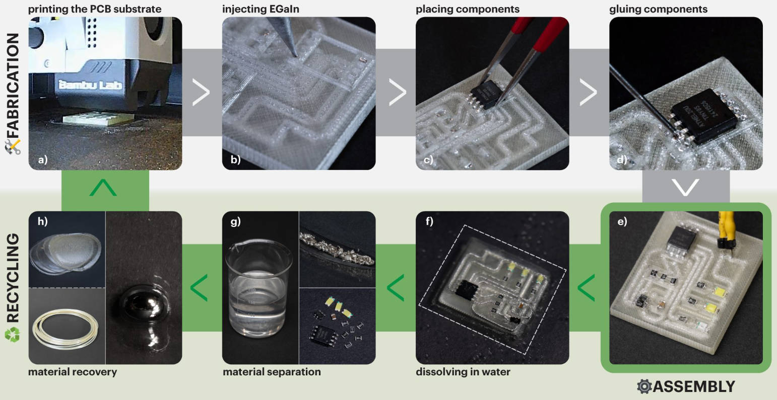 传统的FR-4电路板因其复杂的材料结构,回收过程往往需要大规模工业处理,成本高昂且效率低下。相比之下,DissolvPCB技术通过简单的水浸方式,实现组件分离、液态金属回收和PVA耗材再生,为小型制造空间和原型实验室提供了一种高效的闭环生产解决方案。